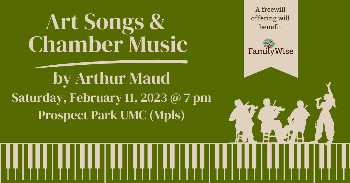 We welcome back the previously postponed Friends of Arthur Maud for an evening of Art Songs & Chamber Music. They will be performing to benefit FamilyWise. Please join us on Saturday, February 11 as we enjoy chamber music composed by Arthur Maud and performed by: