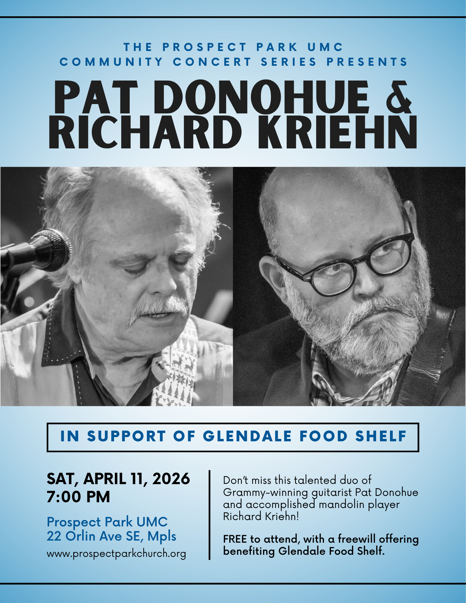 Join us as we welcome back Pat Donohue and Richard Kriehn to the Community Concert Series! You won’t want to miss these veteran performers from ‘A Prairie Home Companion’. The concert is FREE to attend, with 100% of the money raised from our freewill offering going to our neighbors at Glendale Food shelf.