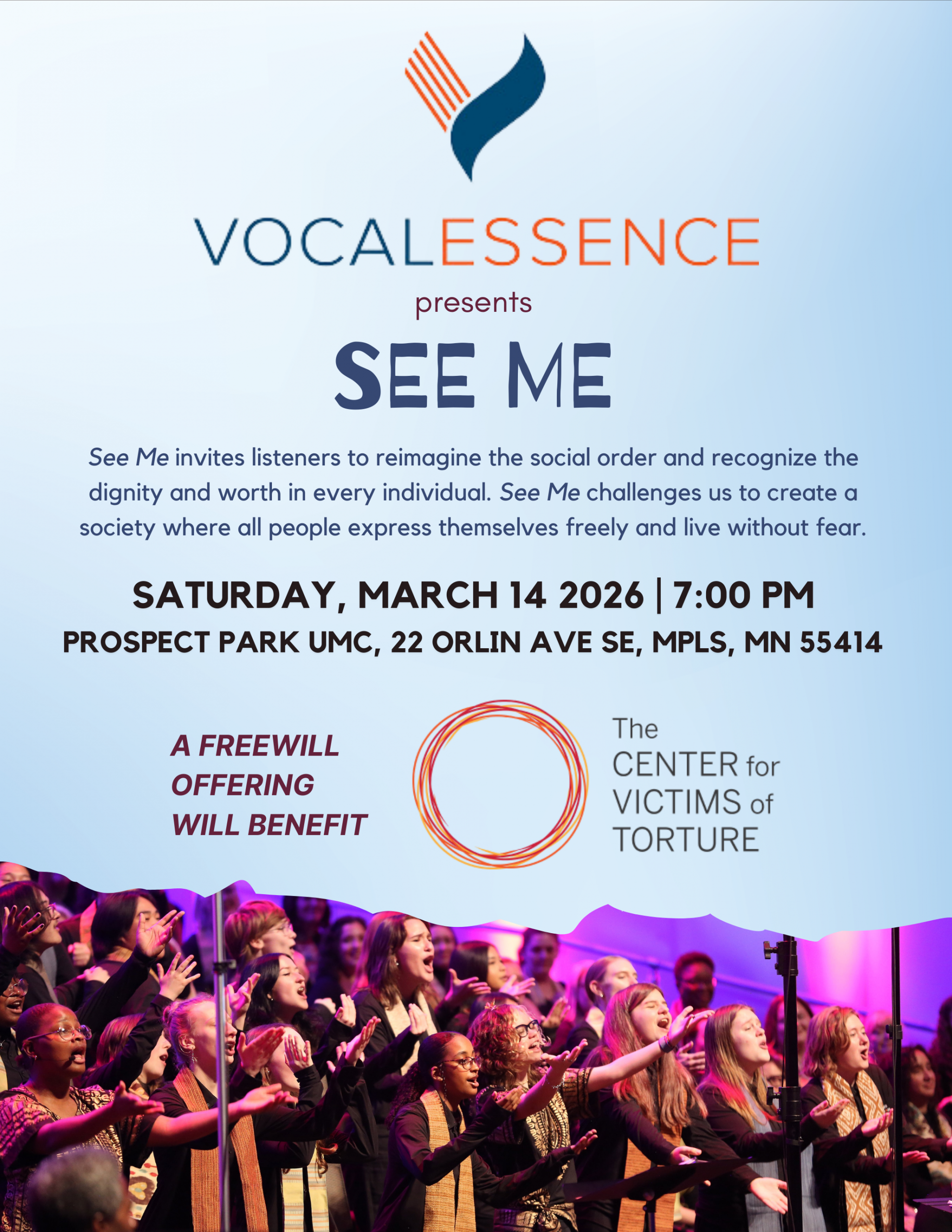 Join us on Saturday, March 14 at 7:00pm as we welcome back VocalEssence: Singers of this Age to the Community Concert Series! The concert is FREE to attend, with 100% of proceeds from a freewill offering benefiting the Center for Victims of Torture.